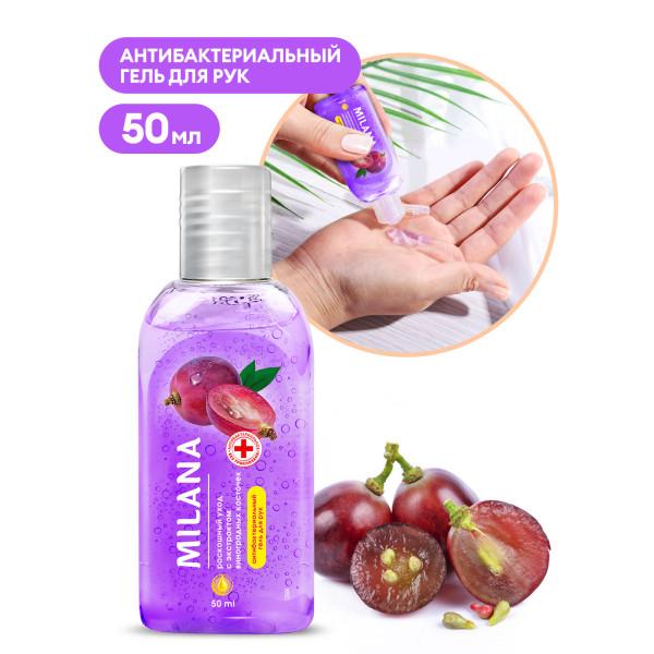 Антибактериальный гель для ухода за кожей рук Milana “Роскошный уход” с экстрактом виноградных косточек. Основной компонент – изопропиловый спирт. Убивает 99,99% наиболее распространенных болезнетворных бактерий, грибов и вирусов. Делает кожу рук мягкой, увлажняет, оставляет ощущение свежести. Не оказывает раздражающего действия.