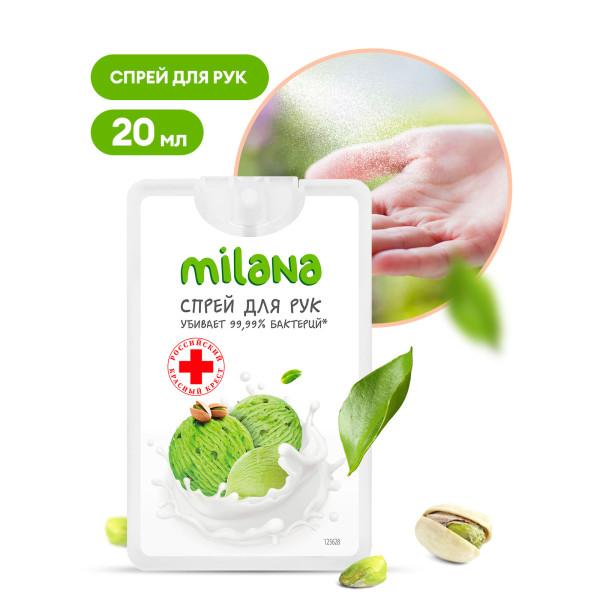 Гигиенический спрей для рук “Milana сливочно-фисташковое мороженое”.Основной компонент — изопропиловый спирт. Убивает 99,99% наиболее распространенных болезнетворных бактерий, грибов и вирусов. Делает кожу рук мягкой, увлажняет, оставляет ощущение свежести. Не оказывает раздражающего действия.